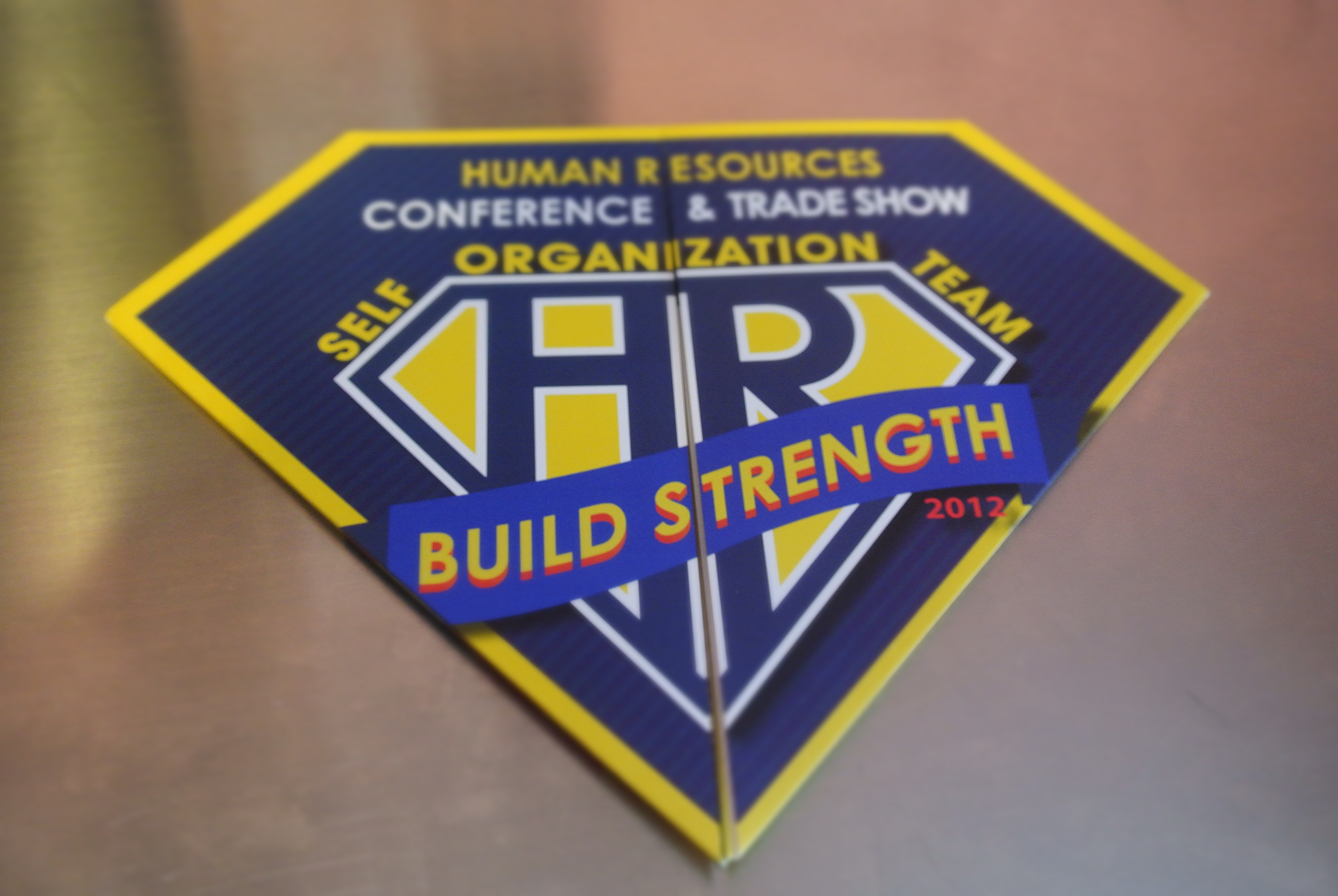 In order to represent this, the imagery of super heros was used as every hero has unique strengths just like every member of the HR community. To reflect this, the invite for the event was shaped into a hero crest and unfolded to reveal all the event details.