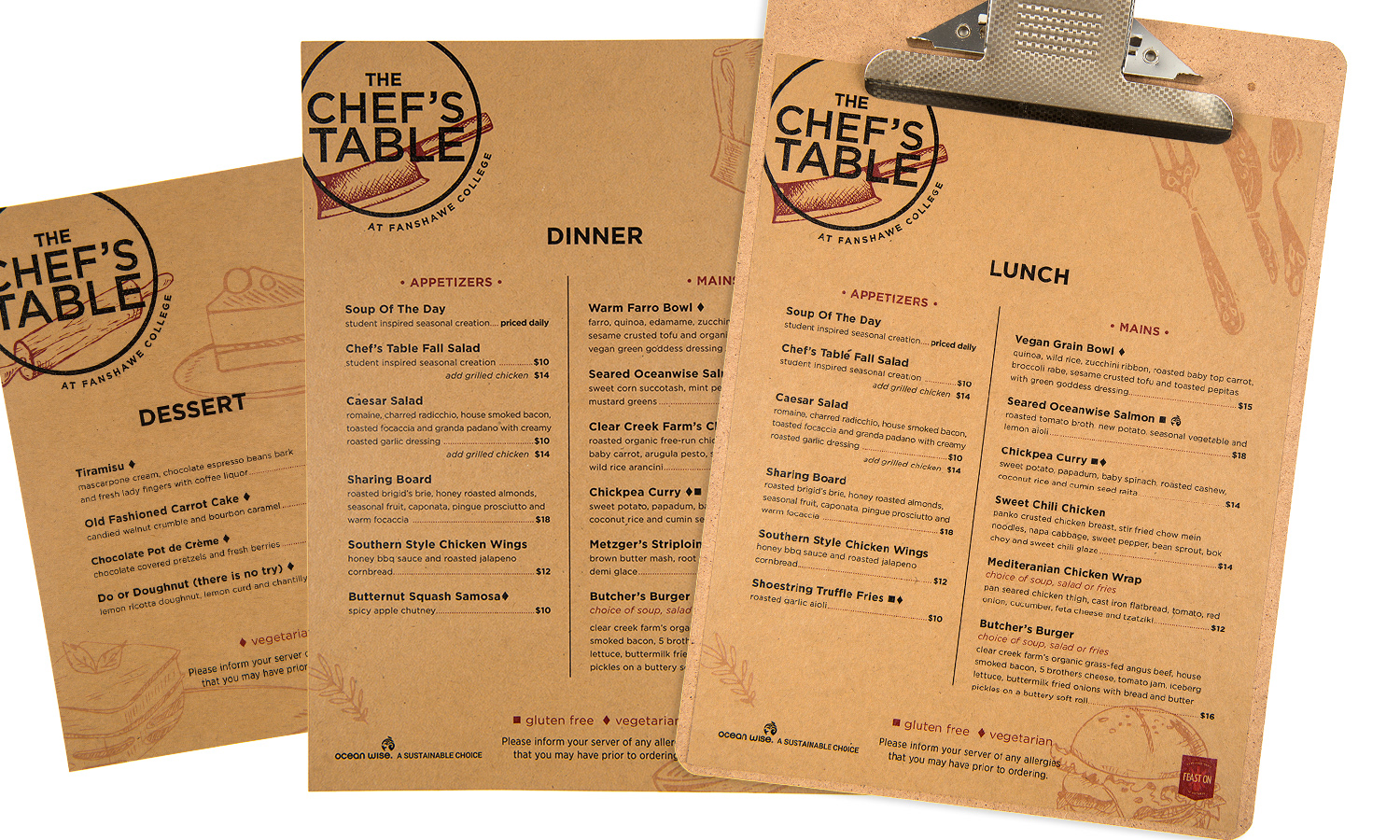 Branding for the student run restaurant: "The Chef's Table at Fanshawe College" in London, Ontario.